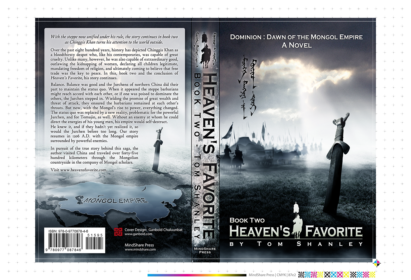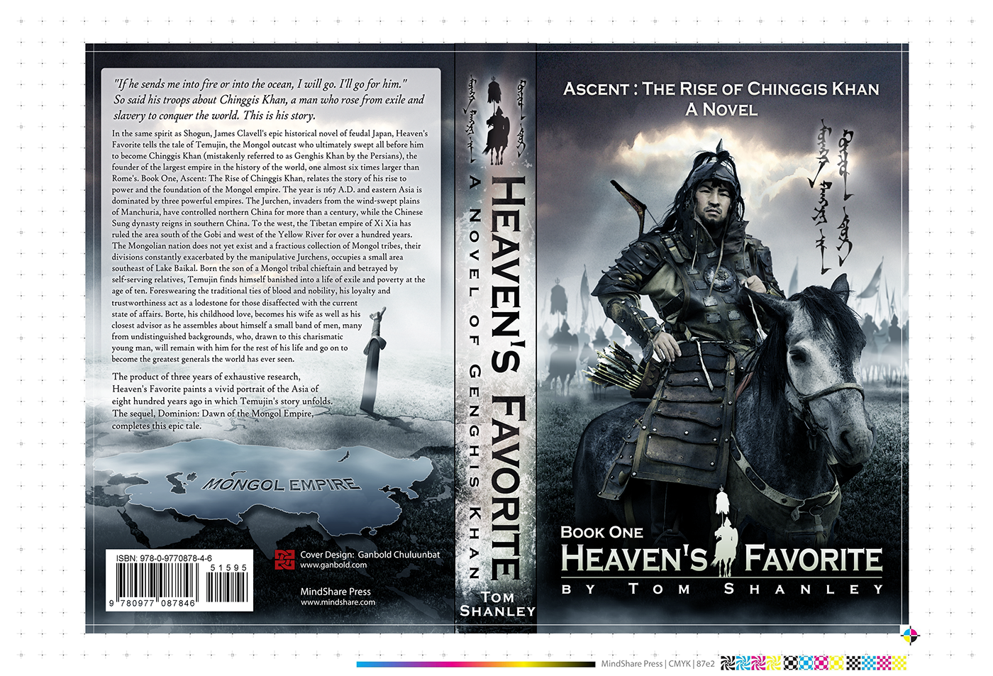 Print Design: A full wrap-around book cover design created for Heaven’s Favorite: The Rise of Chinggis Khan.